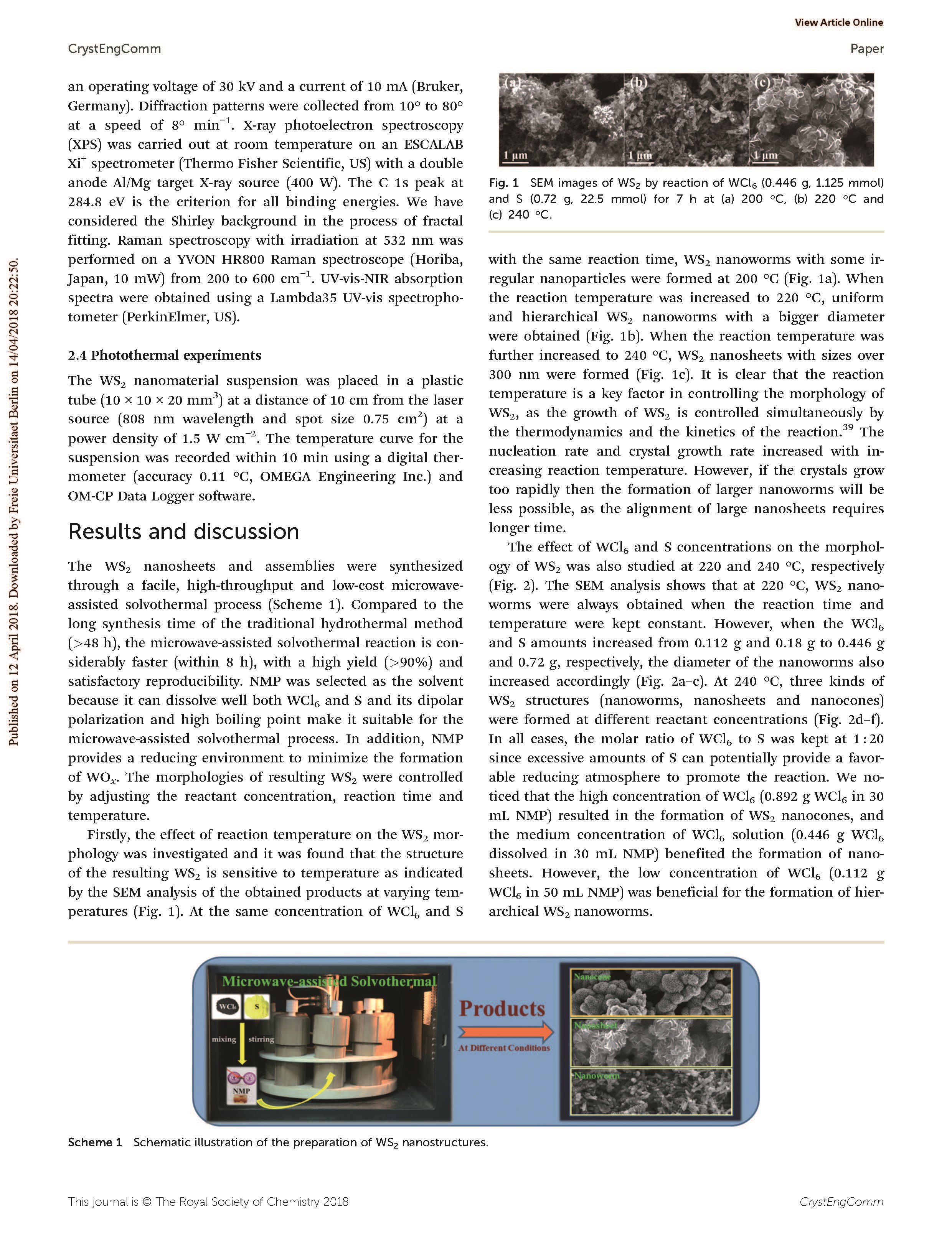 并将它们组装成大量。在这项工作中,我们报告了一种简易高效的微波辅助系统,用溶剂热法合成N-甲基-2-石韦(NMP)中WS2、纳米结构廉价的六氯化钨(WCl6)和元素硫作为原料,WS2的形成通过调节反应物浓度和反应温度,研究了纳米片及其控制组件为不同形貌(如纳米锥和纳米蠕虫)。